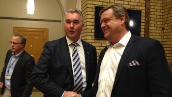 Trond Helleland (H) og Harald Tom Nesvik (Frp) er fornøyd med at begge regjeringspartiene nå sier nei til OL. Foto: Anne Mone Nordahl / NRK