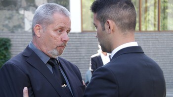Memorial ceremony: Leader of support group the government quarter, John Hestnes, get some comforting words of AUF Mani Hussaini during the commemoration outside the government quarter.